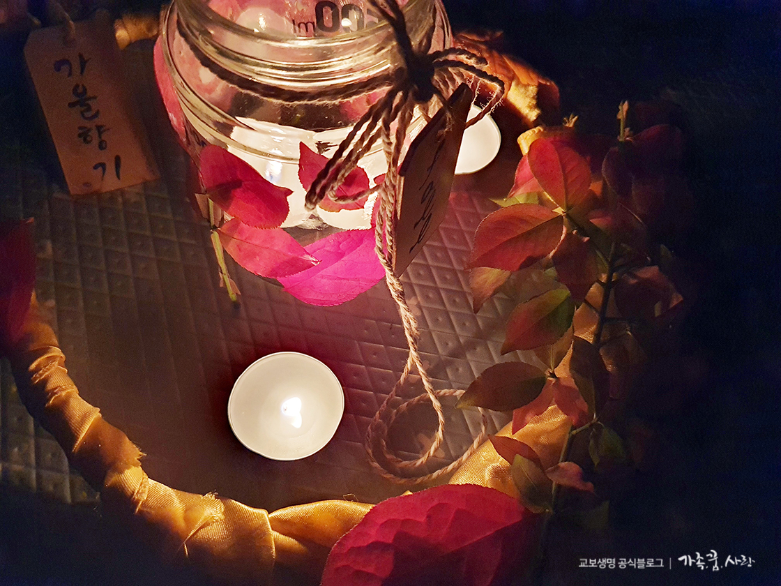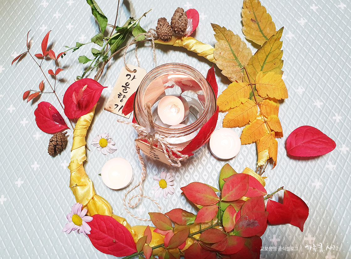 지금까지 낙엽 리스와 낙엽 캔들을 만들어봤는데요, 이렇게 집안 한 켠에 가을 인테리어 소품으로 꾸며주니 깊어가는 가을이 확 느껴집니다. 계절이 바뀌면 집안의 분위기에 변화를 주고 싶은데, 이렇게 그 계절의 자연물을 이용해 감성 돋는 인테리어 소품을 만들어보세요! 작은 변화로도 큰 만족과 행복을 느낄 수 있답니다!