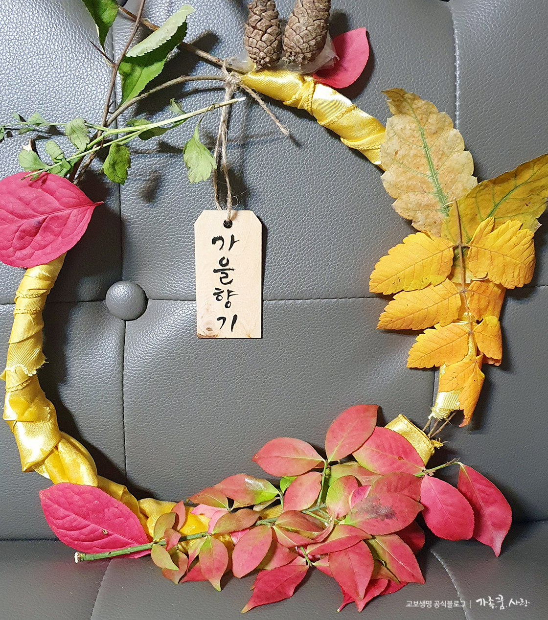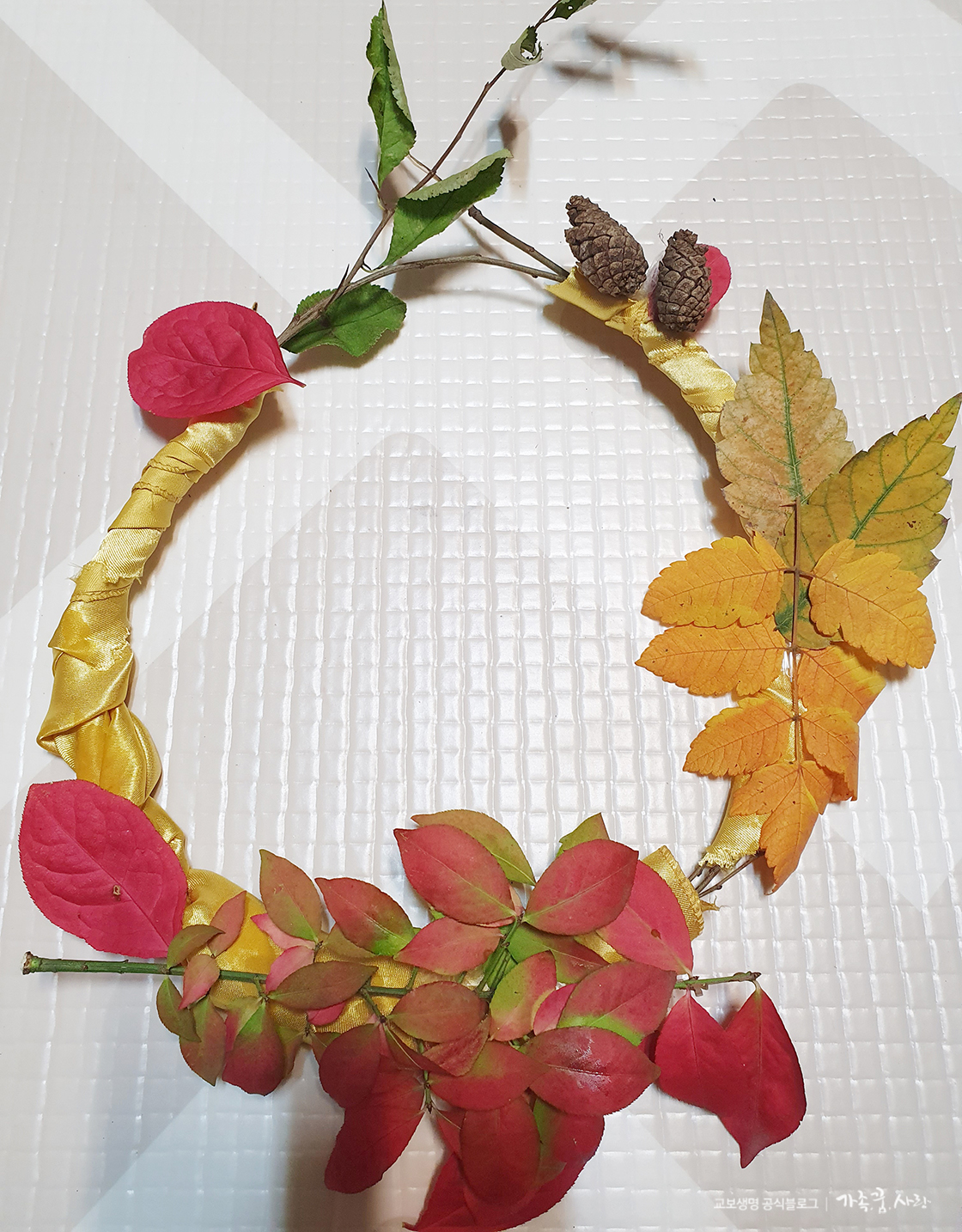 접착체를 바른 리스에 낙엽을 붙여주고, 작은 솔방울까지 붙여주었습니다. 낙엽이 구멍이 나거나 색이 조금 예쁘지 않아도 괜찮아요. 다른 낙엽들과 어우러지다 보면 자연스레 분위기 있는 가을의 감성을 연출해준답니다. 예쁜 단풍잎 몇 개만 붙였을 뿐인데도 가을 분위기를 물씬 풍깁니다. 울긋불긋 물든 가로수의 단풍을 고스란히 옮겨 놓은 것 같네요.