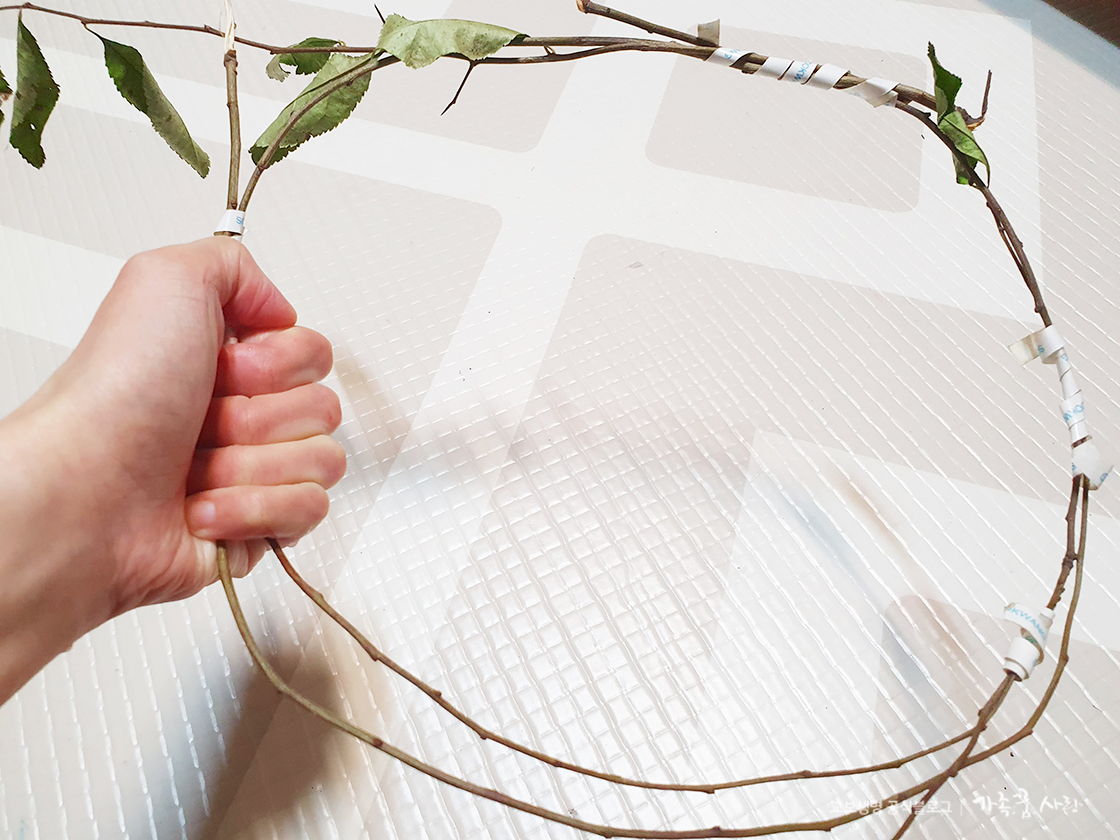 나뭇가지 리스를 만드는 방법은 간단합니다. 구부려지는 얇은 잔가지를 동그랗게 말아 노끈이나 넝쿨로 고정시켜주세요. 만약 잘 구부러지지 않는다면 물에 적셔 수분기가 있는 상태로 작업하면 더 잘 휘어진답니다. 바싹 말라버린 가지는 쉽게 부러질 수 있으니 주의해주세요.