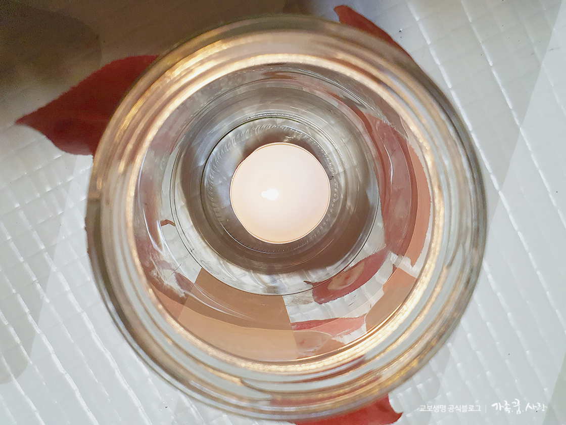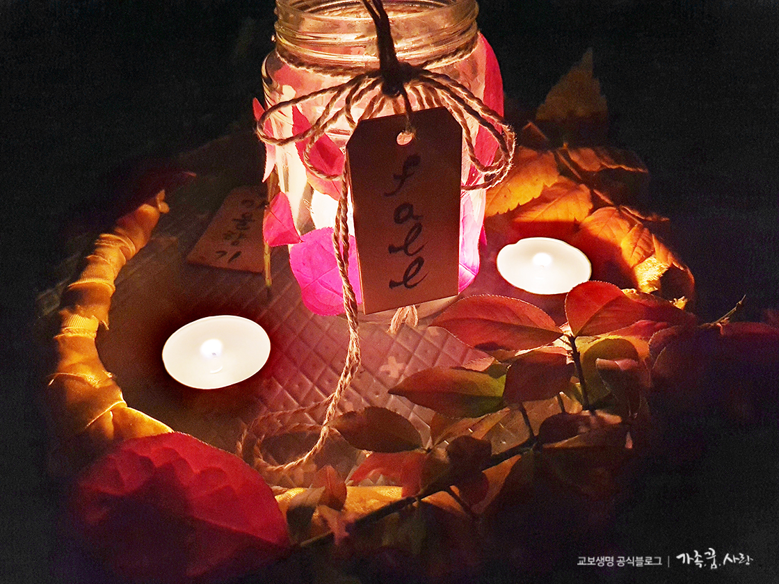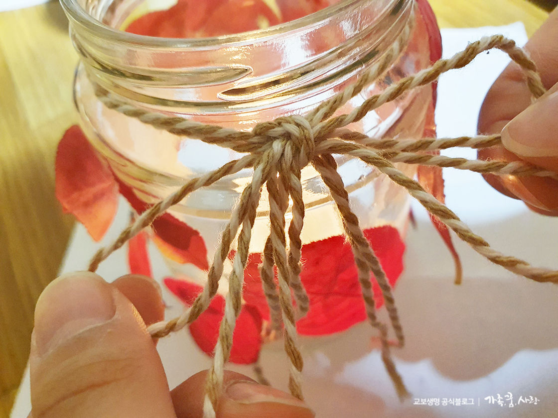 장식한 유리병 안에 캔들을 넣고 불을 붙이면 기본형 낙엽 캔들 완성입니다. 이렇게만 해도 꽤 멋진 가을 분위기를 연출할 수 있습니다.