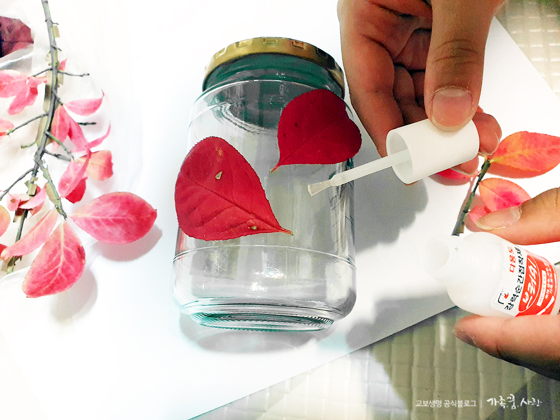 낙엽 캔들 역시 가을을 맞이해 작은 변화를 줄 수 있는 인테리어 소품입니다. 먼저 세척한 유리병을 바짝 말려주세요. 그 뒤 낙엽을 꾸며줄 자리에 접착제를 바른 뒤 낙엽을 붙이고 30초 정도 기다려주세요. 낙엽은 바싹 마른 낙엽보다는 살짝 덜 말라 수분기가 있는 낙엽이 더 잘 붙습니다.
