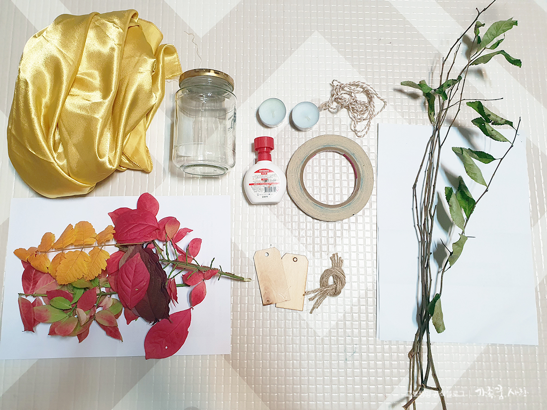 낙엽 캔들 재료: 유리병, 다양한 낙엽, 소형 캔들, 노끈, 목공풀(접착제)