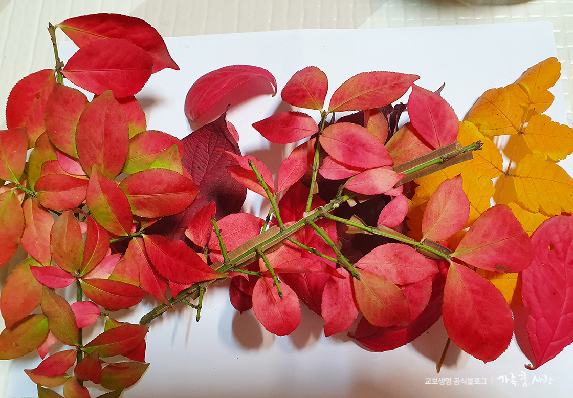 낙엽을 붙일 때는 큰 낙엽부터 위치를 잡은 뒤 모양을 내고 그 후 작은 낙엽으로 꾸며주세요.