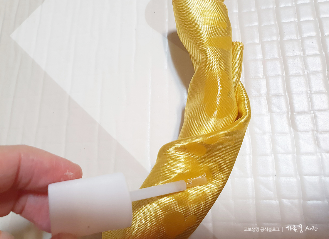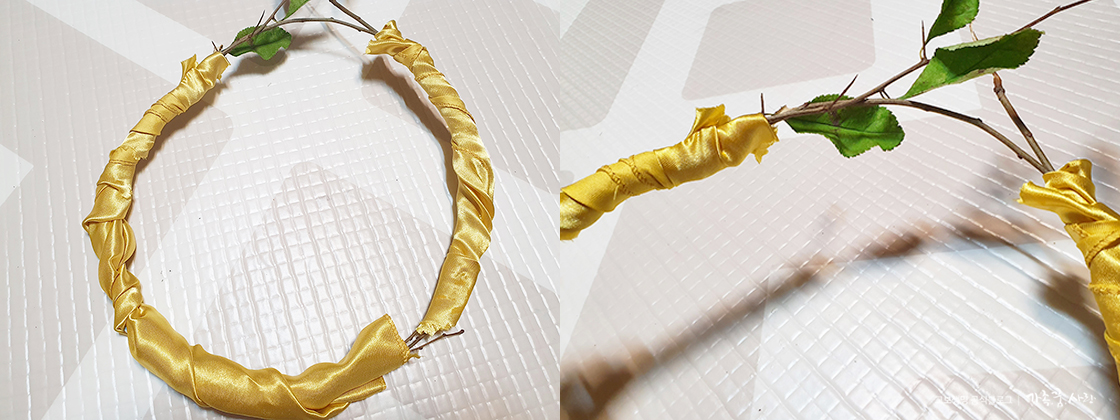 다음은 동그랗게 만 나뭇가지를 보자기 등의 천으로 감싸주세요. 낙엽과 잘 어울리는 색의 보자기를 잘 감아주고, 가지 부분에 잘 꼬아서 고정해주면 됩니다. 보자기는 팽팽하게 감기보다 조금 느슨하고 자연스럽게 감아야 더 예쁘답니다. 전체를 다 감아도 되고, 반은 나뭇가지 그대로 두고 반만 테두리만 감싸도 색다른 분위기를 낼 수 있습니다. 이렇게 잎사귀가 보이는 부분은 보자기를 감지 말고 그대로 두세요!
