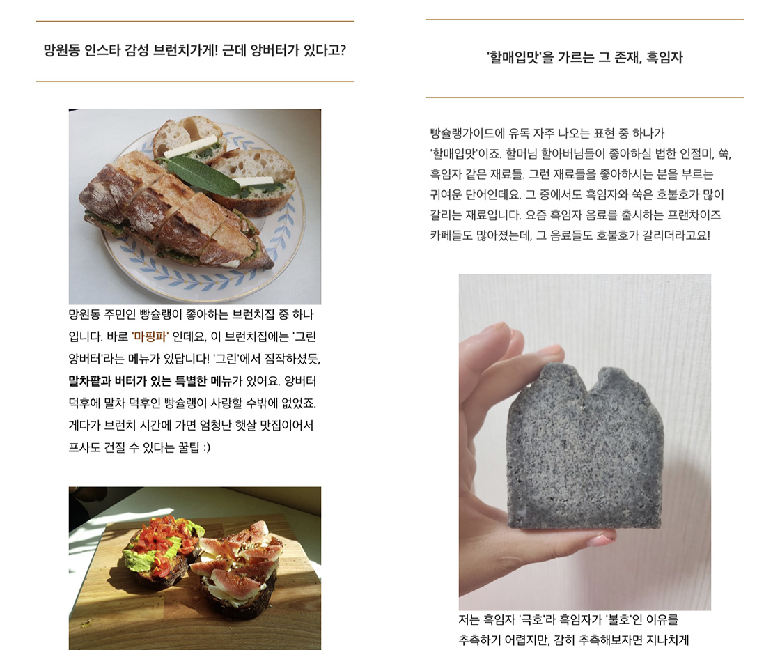 ‘빵’이라는 딱 하나의 주제만으로 운영하는 뉴스레터도 있습니다. 신선하고 맛있는 빵 이야기를 전하는 ‘빵슐랭가이드’는 현재 기자로 활동 중인 글쓴이가 직접 발로 뛴 소식을 다룬 만큼 정보성에 글빨까지 읽는 재미가 가득합니다.