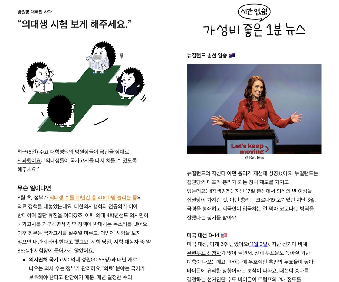 ‘뉴닉’은 평일 새벽마다 전달되는 시사 전문 뉴스레터입니다. “우리가 시간이 없지, 세상이 안 궁금하냐!”라는 깜찍하면서도 공감되는 문구로 밀레니얼 세대들의 공감을 이끌어내 20만 명 이상의 구독자를 보유한 영향력 있는 매체이기도 합니다. ‘고슴이’라는 귀여운 캐릭터가 어려운 시사 이야기를 맛깔나게 풀어주죠.