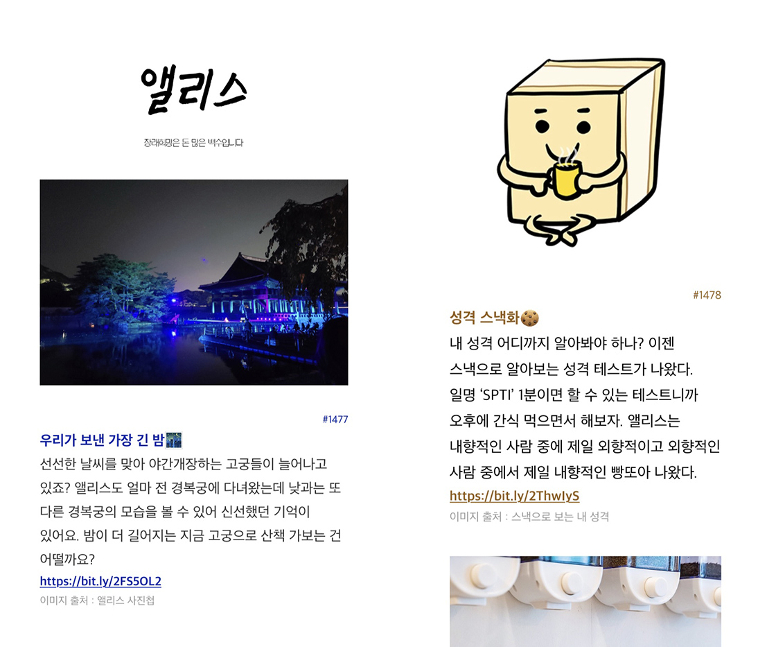 전문적인 정보 습득보다는 SNS 상 유행인 이슈나 따끈따끈한 문화 관련 소식 등 트렌디하지만 가벼운 뉴스를 원한다면 ‘앨리스’에서 답을 찾을 수 있습니다. ‘앨리스’는 SNS에서 회자되는 재미있는 이슈나 인기 전시회, 숨은 산책로 등 다양한 문화 소식과 관련한 내용을 짤막하게 전달해주는 뉴스레터입니다.