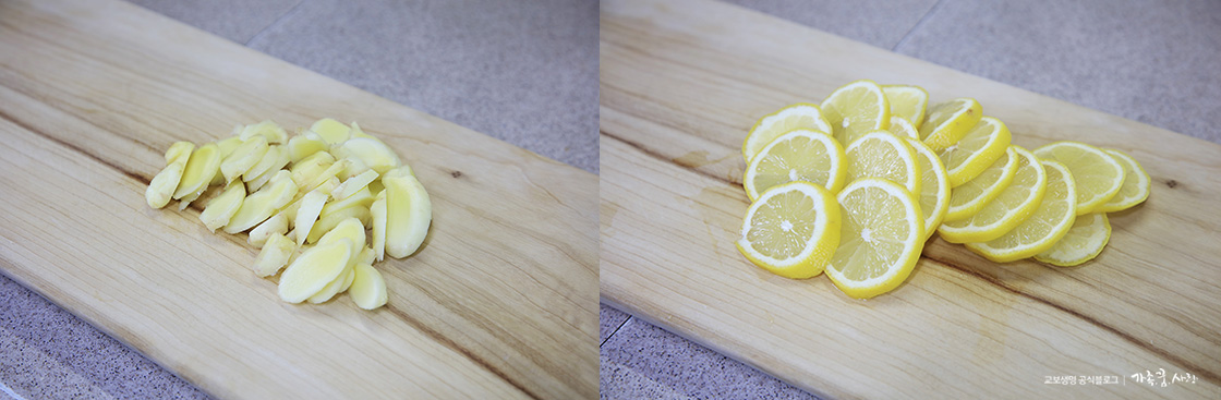 1. 재료 준비가 끝나면 생강 껍질을 벗긴 후 얇게 썰어주세요. 레몬도 깨끗이 씻은 후, 슬라이스 형태로 잘라주세요.