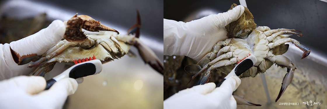 간장게장은 꽃게를 통째로 사용하는 만큼 꽃게 겉을 잘 닦는게 중요합니다. 솔을 이용해 전체적으로 싹싹 문질러 닦아주세요. 다리 사이사이도 조심해서 잘 닦으면 됩니다. 배 바닥 쪽 껍데기는 손으로 당겨 올려 안쪽까지 닦아주세요.