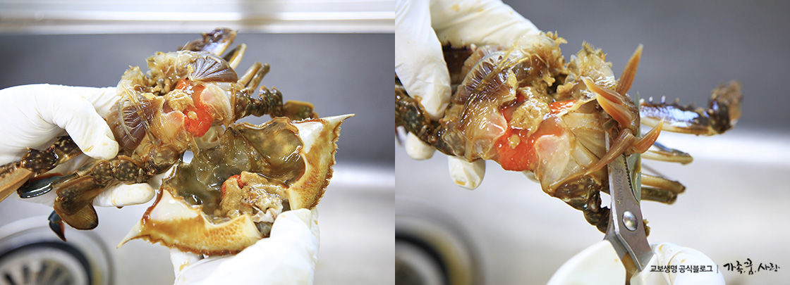 잘 숙성된 꽃게는 먹기 전에 가위로 손질하는게 좋습니다. 배딱지를 열어 제거한 후 입부분 잘라 손을 넣어 열어주면 등딱지와 깨끗하게 분리됩니다. 아가미 부분도 모두 가위로 잘 잘라준 후 반으로 잘라 그릇에 담아내면 먹기에 한결 수월합니다.