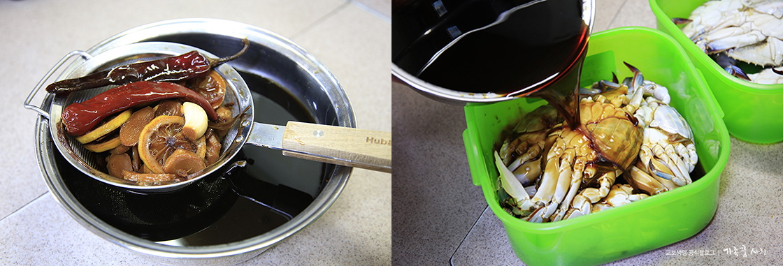 4. 절임물이 완전히 식으면 재료들을 건져낸 후 간장물을 꽃게 위에 부어 줍니다. 밀폐용기를 이용하면 편합니다.