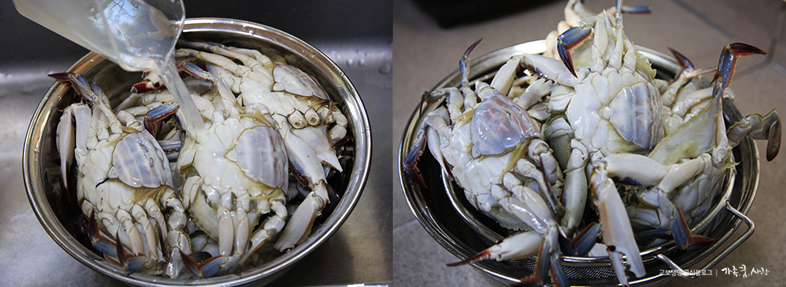먼저 싱싱한 가을 꽃게를 준비하세요. 잡아서 바로 급속 냉동시킨 꽃게를 구입하는게 더 편합니다. 활꽃게를 그대로 쓰면 살이 흘러내려 맛이 없어지거든요. 활꽃게인 경우엔 냉동실에서 얼린 후 사용하는 것이 좋습니다. 너무 큰 꽃게보다는 1kg에 4마리 정도 되는 크기가 간장게장 만들기에 적당합니다.