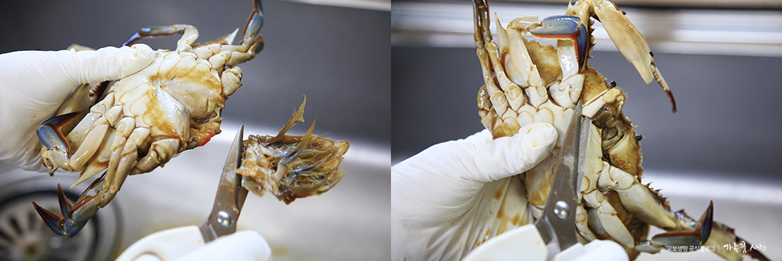 잘 숙성된 꽃게는 먹기 전에 가위로 손질하는게 좋습니다. 배딱지를 열어 제거한 후 입부분 잘라 손을 넣어 열어주면 등딱지와 깨끗하게 분리됩니다. 아가미 부분도 모두 가위로 잘 잘라준 후 반으로 잘라 그릇에 담아내면 먹기에 한결 수월합니다.