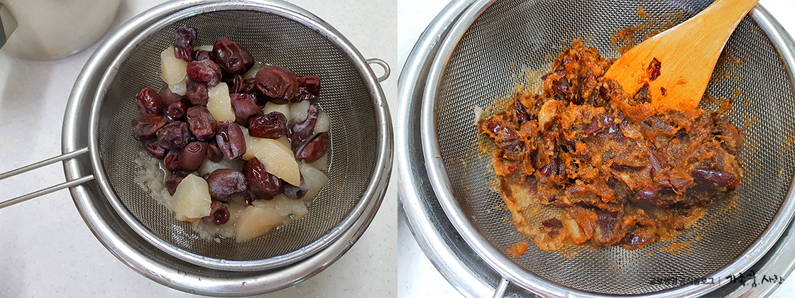 어느 정도 식으면 건더기는 채반에 걸러주세요. 대추와 배를 삶아낸 물은 따로 보관합니다. 주걱을 이용해 건더기를 채반 아래로 내려주세요. 건더기가 뻑뻑하면 대추와 배를 삶은 물을 조금씩 추가해가면서 풀어주면 잘 내려갑니다. 이 과정에서 대추씨를 걸러내고, 대추의 딱딱한 껍질 부분도 걸러낼 수 있어요.