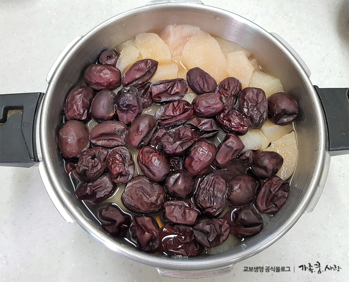 대추와 배를 압력솥에 담고, 물 2리터를 넣은 후 푹 끓여주세요. 압력솥의 추가 돌아가기 시작하면 15분 정도 센 불로 끓이다가 불을 끄면 됩니다. 압력솥을 이용하면 재료를 가는 것보다 더 진한 차를 만들 수 있습니다. 압력솥이 없으면 일반 냄비에 물을 더 넣어서 재료가 푹 익을 때까지 끓여주세요. 이때 생강을 좋아하시면 같이 넣어주세요. 생강청을 쓸 생각이시면 뒤에 따로 넣으면 됩니다. 재료가 흐물 해 보이면 잘 끓은 것이랍니다. 이 상태로 충분히 식혀주세요.