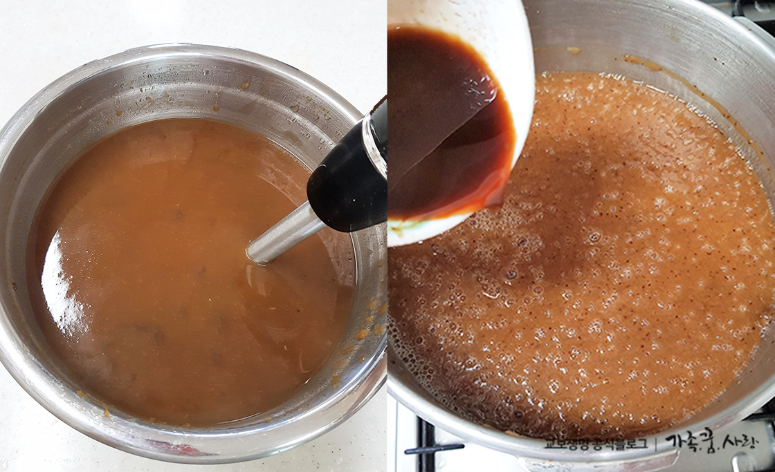 채반에 걸러낸 건더기는 여전히 영양소를 듬뿍 머금고 있습니다. 씨와 딱딱한 것들을 빼고 우려낸 대추 물과 합친 후 핸드블랜더로 곱게 갈아주면 물이 좀 더 진해집니다. 맑은 차가 좋은 분들은 이 과정을 생략해도 됩니다. 곱게 간 대추차를 다시 냄비에 넣고 생강청 반 컵을 넣어 원하는 농도가 될 때까지 끓여주세요. 앞 과정에서 생강을 같이 넣었으면 생강청은 더 넣지 않아도 됩니다. 점성이 있기 때문에 한 번씩 국자로 저으며 졸이면 대추차가 완성됩니다!
