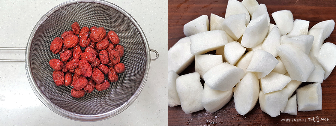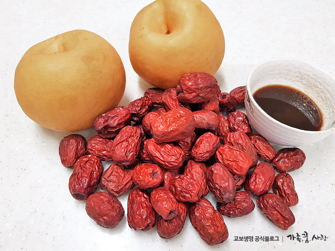 대추차 만들기 재료: 대추 50알, 배 2개 (생강 또는 생강청)