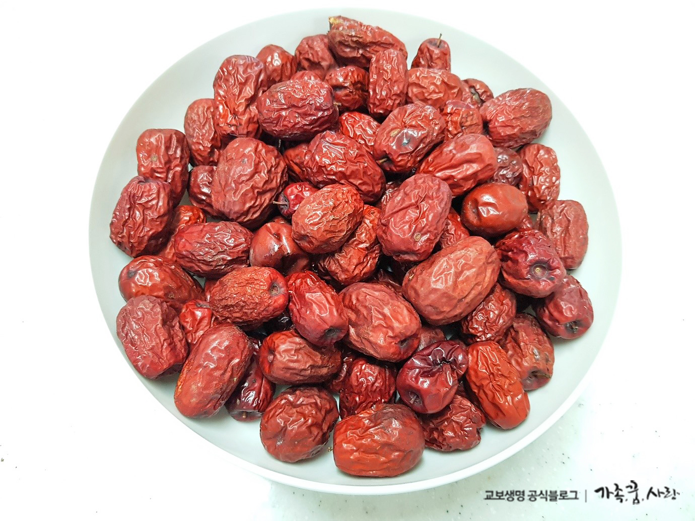약재나 식재료로 주로 쓰는 대추는 말린 대추입니다. 생대추를 따서 잘 말린 것이죠. 씨를 제거하고 편으로 만들어 보관하기도 하고, 씨앗이 있는 채로 그대로 말리기도 합니다. 대추는 말리는 과정에서 먼지와 불순물이 묻기 때문에 먹기 전에 꼭 씻어야 합니다. 깨끗한 수돗물에 담아 조물조물 씻어주고, 부드러운 솔로 틈새에 있는 먼저를 제거해주세요. 한참 닦다 보면 물이 금세 더러워지는 걸 확인할 수 있습니다.