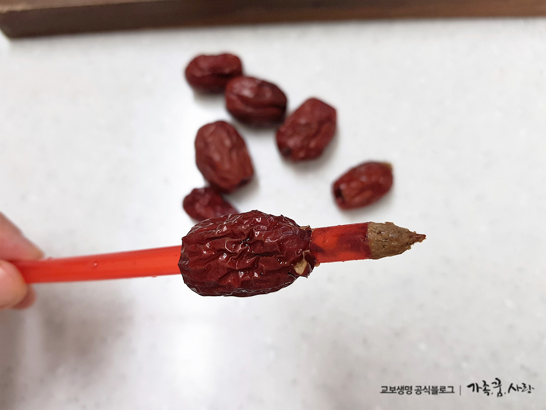 대추 고명을 차에 넣어 먹으면 씹히는 식감과 향이 더 좋아집니다. 문제는 씨 제거인데 대추가 작아서 칼을 이용해서 제거하려면 좀 귀찮습니다. 이때 빨대가 있으면 좀 더 안전하고 간편하게 대추씨를 제거할 수 있죠. 보통 대추 고명은 칼로 사과껍질을 벗기듯이 대추를 깎아 씨를 빼내는 데, 단단한 빨대를 이용해 대추 중심부를 관통시키면 씨만 쏙 분리되어 나옵니다. 씨에 붙은 대추 과육을 최소화할 수 있는 장점까지 지닌 효율적인 방법입니다.