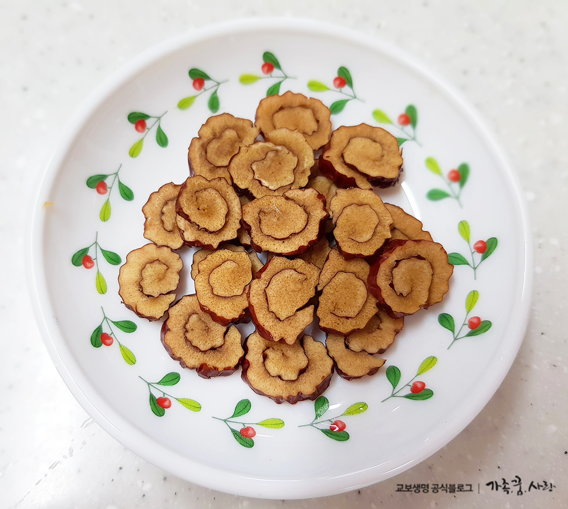 빨대로 씨를 뺀 뒤 대추 과육을 돌돌 말아 얇게 썰어주면 예쁜 꽃 모양 대추 고명이 완성됩니다.