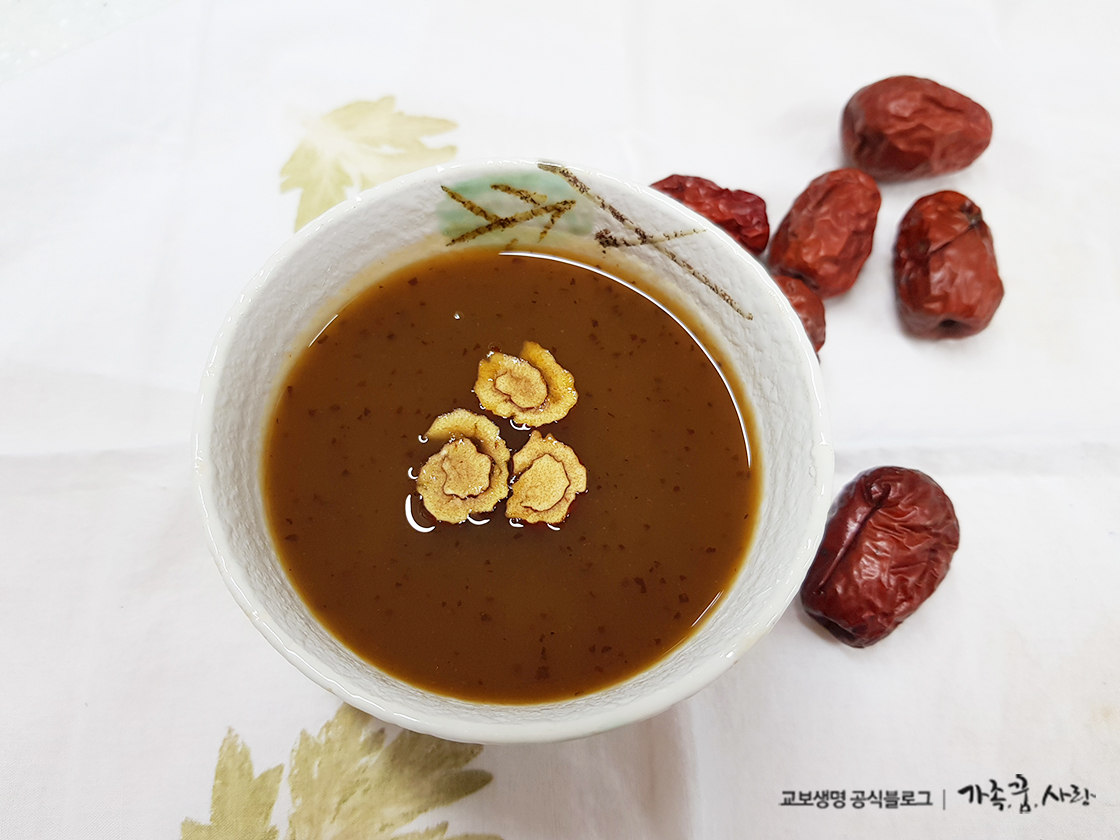 정성을 가득 담아 보약 같은 진한 대추차가 완성되었습니다. 지금까지 대추와 배, 생강을 넣어 영양과 맛이 가득한 대추차를 만들어봤습니다. 대추와 배의 달콤함과 생강의 진한 향기가 더해져 차 한 잔에 절로 몸이 건강해지는 느낌입니다. 점점 날씨가 쌀쌀해지는데요, 건강하고 생기 있게 올 겨울을 보내야 하는 내 몸을 위해 진한 대추차 준비해 보시면 어떨까요?