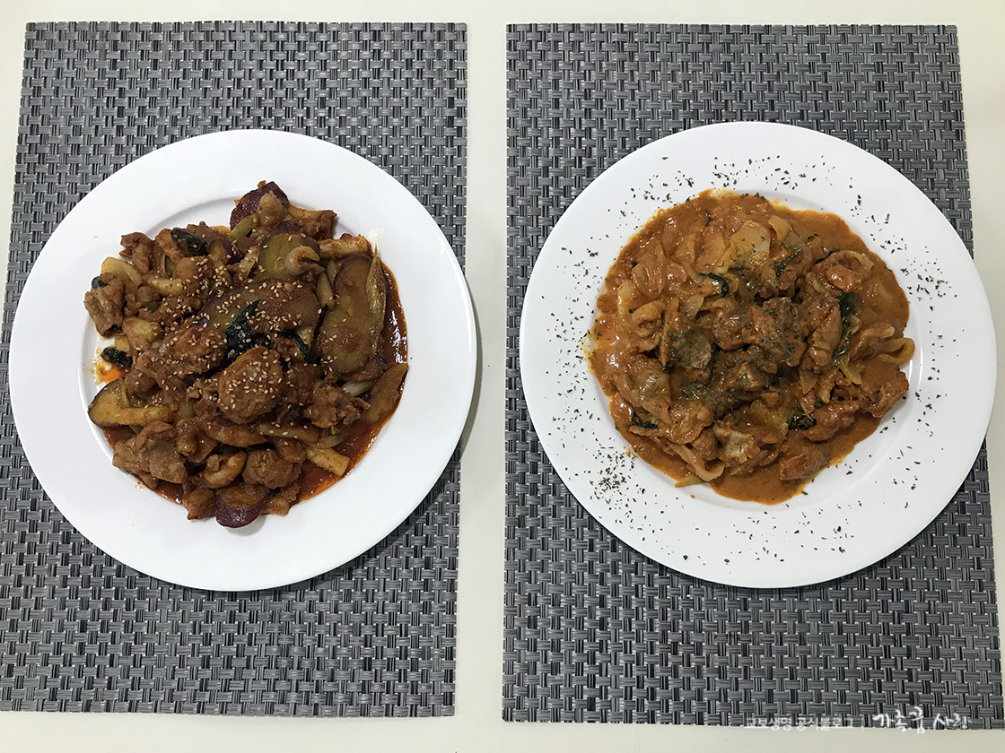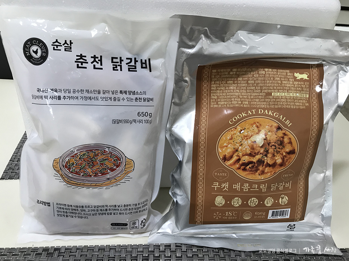 마켓컬리에서 가장 잘 나가는 닭갈비는 미트클레버의 '순살 춘천 닭갈비'로 프리미엄 가공육 기업 제품입니다. 유명 브랜드인 만큼 맛도 좋아 매번 빠르게 품절되는 메뉴 중 하나죠. 쿠캣마켓의 인기 닭갈비는 PB 제품인 매콤 크림 닭갈비로 일반적인 닭갈비에 '크림소스'를 더한 퓨전 요리입니다. 레시피에서는 닭갈비 하면 떠오르는 라면이나 우동 사리가 아닌 '파스타면'을 추천하는 점이 특이한데, 쿠캣은 기존 레시피가 아닌 재미있는 요리를 추구합니다.