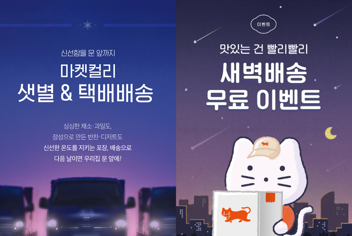 마켓컬리를 벤치마킹한 쿠캣마켓은 2020년 9월 25일 자정에 새벽 배송 서비스를 시작한 후발 주자입니다. 매일 오후 8시 이전 주문은 다음 날 오전 7시까지 배송을 진행하며, 공휴일에도 운영되는 것이 특징이죠. 아직은 새벽 배송이 초기 단계라 배송지역은 서울과 수도권에 한정돼 있지만 빠른 속도로 성장하고 있습니다. 쿠캣마켓은 지난 4월 회원 수 55만 명, 올 1분기 매출 93억 원을 기록했습니다.