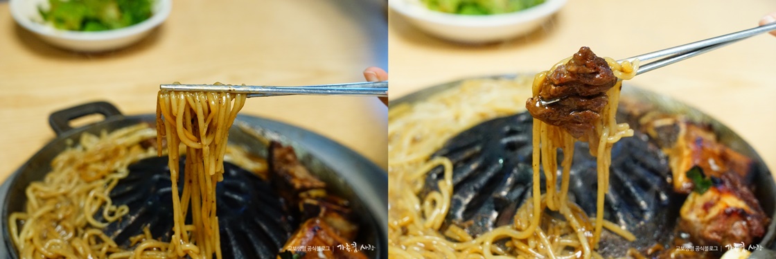 감자 사리는 밀가루 면보다 훨씬 매력적입니다. 부드러운 쫄면 식감으로 쫄깃하면서도 호로록 호로록 잘도 넘어갑니다. 맛은 갈비 양념과 육수가 충분히 배어들어 그런지 이상하게(?) 짜장면 비슷한 맛이 났어요. 식감에 한 번, 맛에 한 번, 갈비와 조화에 한 번! 계속 놀라면서 먹게 되는 감자 사리~ 이것이 정녕 2,000원의 행복이 아닐까요~
