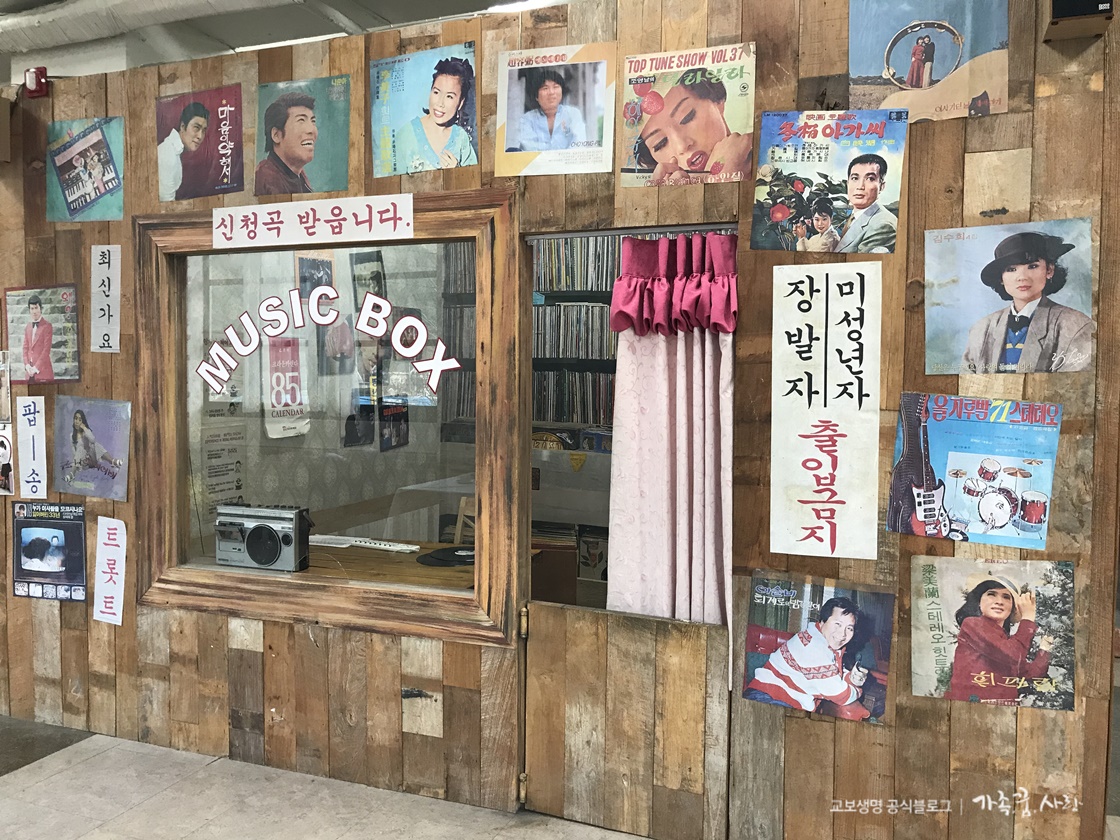 다방에는 각종 LP판이 가득 찬 DJ 부스의 모습도 보실 수 있는데요, 음악다방답게 흘러나오는 음악도 김광석 노래 등 추억의 곡들이었습니다. DJ 부스 안으로 들어가 볼 수도 있으니 레트로 한 감성의 사진도 찍어보세요.