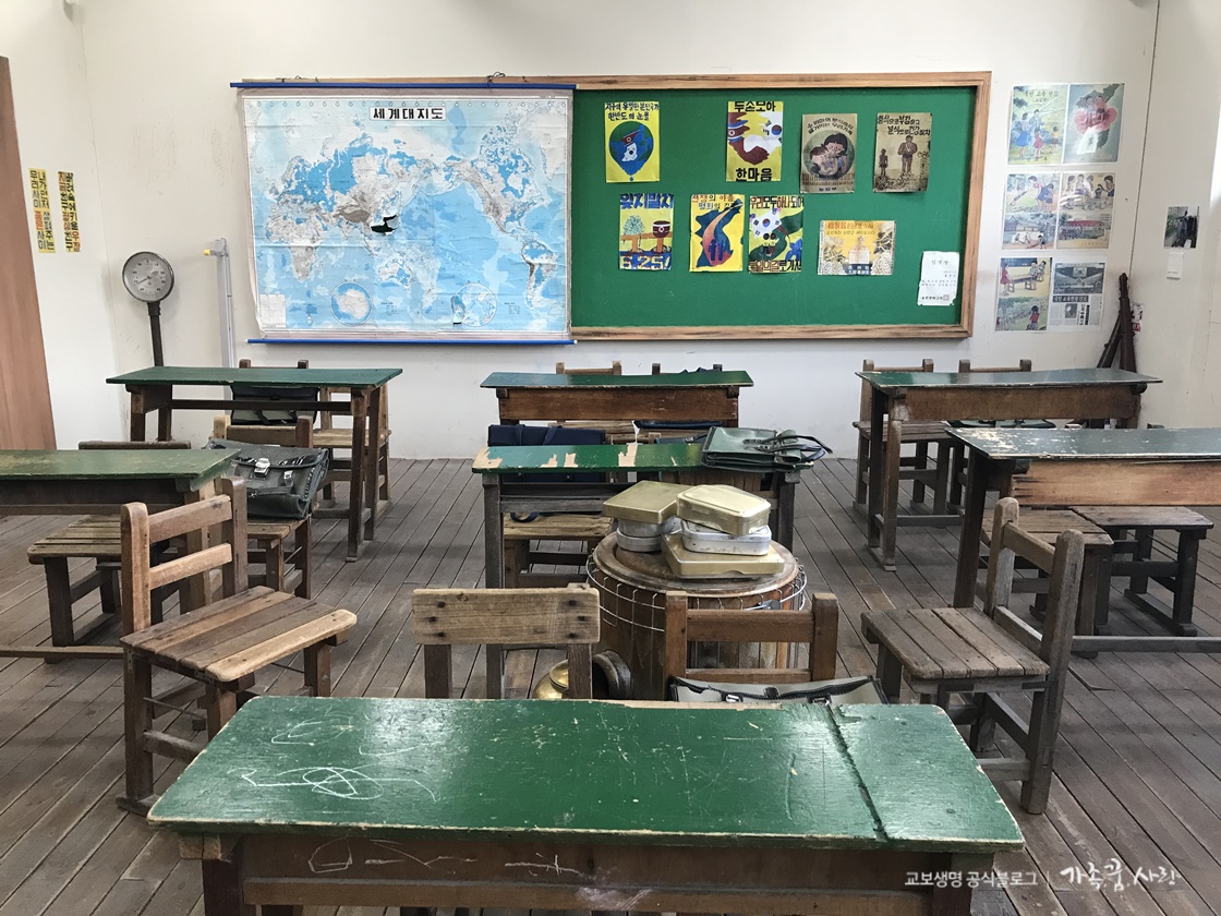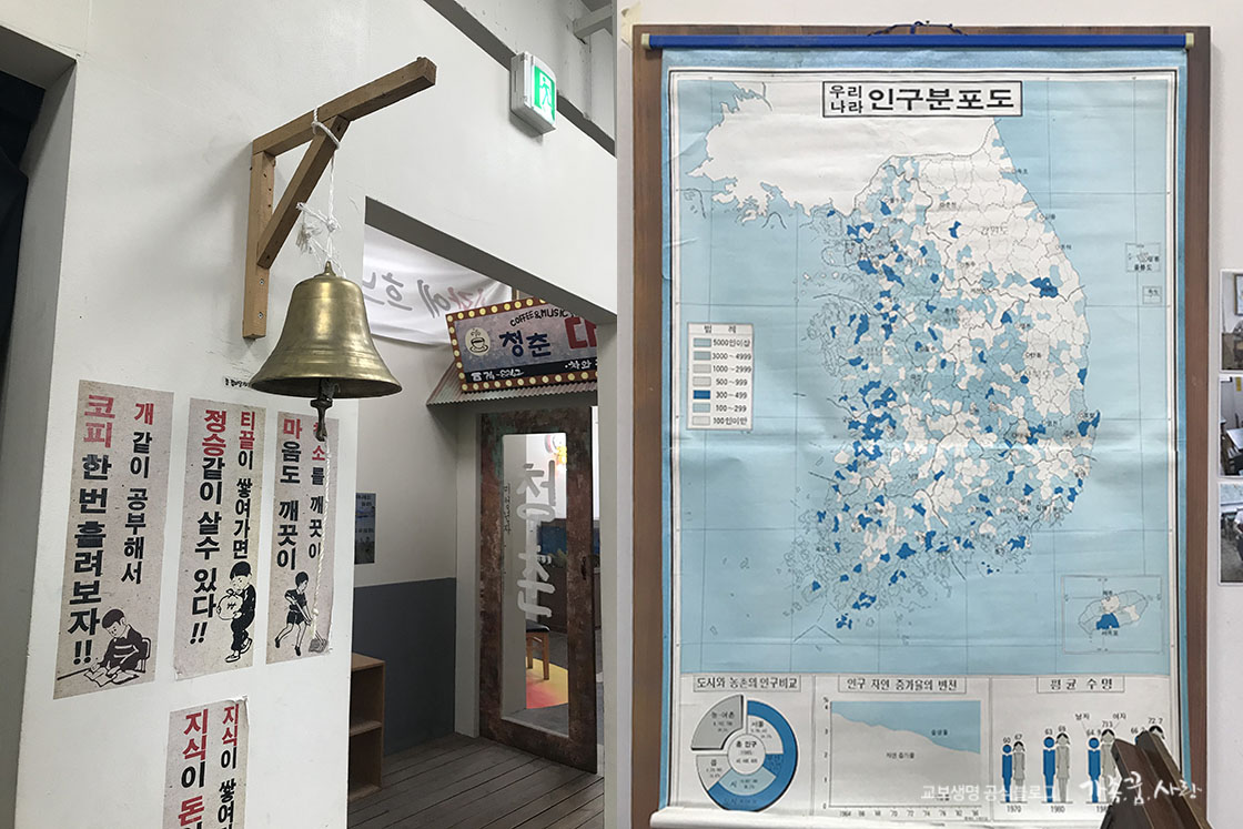 70~80년대 국민학교 교실의 모습을 연상시키는 소품들도 많았습니다. 수업의 시작과 끝을 알려준 종도 있고, 교실마다 붙어있는 우리나라 인구분포도도 교탁 옆에 자리하고 있습니다.