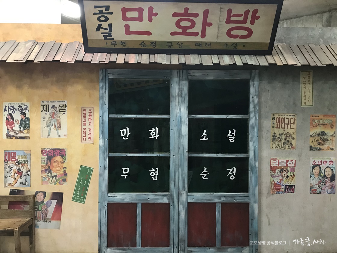 다음은 만화방인데요, 지금은 자취를 감춘 곳이지만, 1970년대에는 1만 8000여 곳에 달할 만큼 만화방이 전성기를 이루었죠. 벽에 보시면 외인구단, 만화왕국 등 당시 엄청난 인기를 누렸던 만화들의 포스터가 붙어 있습니다.