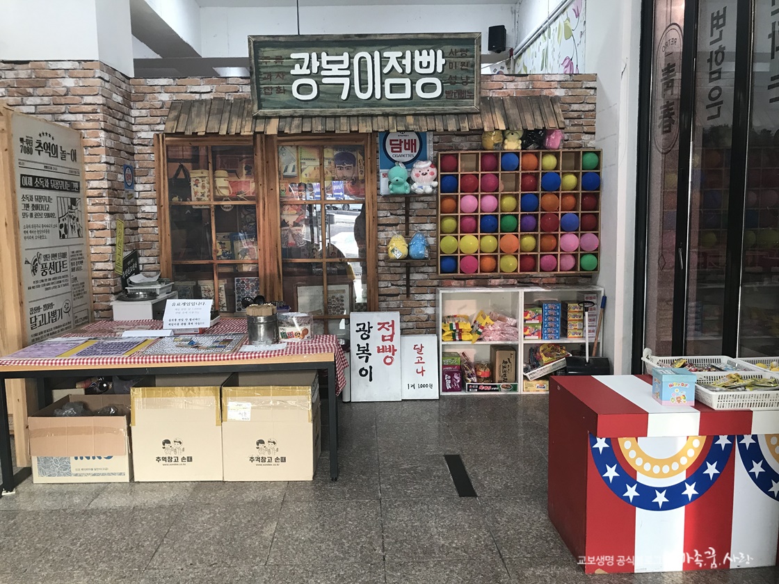 마지막으로 잡화점 ‘광복이점빵’에서 뽑기와 풍선 터뜨리기 등의 놀이를 하실 수 있습니다. 뽑기 등수에 따라 상품도 있고, 쫀드기, 아폴로 등 옛날 군것질거리도 구매할 수 있죠. 게임도 하고 상품도 얻는 일석이조의 경험을 ‘광복이점빵’에서 해보시길 바랄게요!