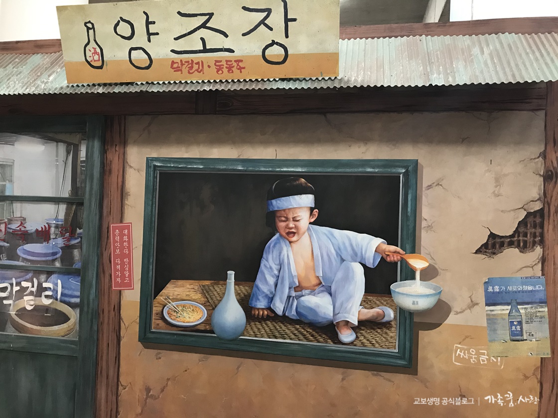 박물관은 1층과 2층으로 구성되어 있어요. 1층은 정겨운 옛날 골목을 재현했는데요, 재미있는 볼거리를 즐기며 사진 찍는 재미가 쏠쏠합니다. 처음 눈에 들어온 곳은 양조장입니다. 갈라진 황토벽부터 손으로 쓴 간판, 낡은 지붕까지 힘들 때면 술을 한잔 기울이던 옛날 양조장의 모습이 떠오르지 않나요? 그림에 있는 막걸리 한 사발을 받아 들고 사진을 찍으면 과거로 돌아간 듯한 느낌을 받는 것 같습니다.