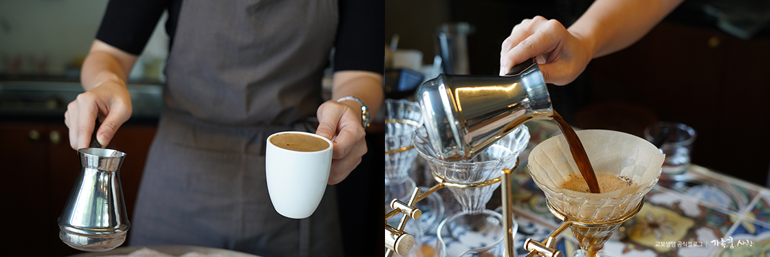 메뉴를 살펴보면 샌드커피와 브루잉 커피 2종으로 나뉘어 있는데요. 원두 가루+물+400도 모래에서 끓인 커피를 그대로 마시면 샌드커피, 여과지에 한 번 걸러 주면 브루잉 커피가 됩니다.