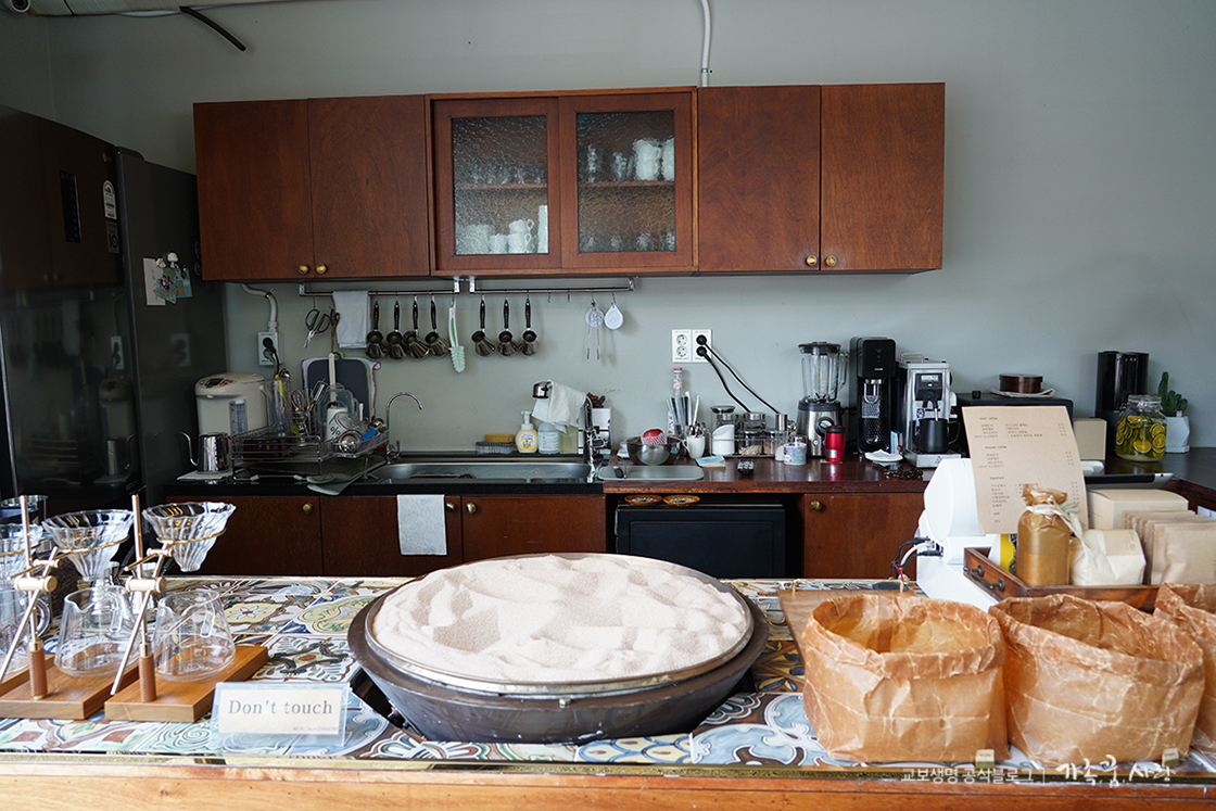 카페에 들어가자마자 시선을 사로잡는 모래! 이것이 바로 샌드커피를 만드는 주인공입니다. 터키쉬 커피는 커피 머신에서 고압으로 에스프레소를 추출하는 게 아니라 원두 가루에 물을 넣고 400도의 모래에서 끓여 커피를 추출합니다. 처음 들어보는 커피 추출 방식에 일단 호기심이 가득 찹니다.