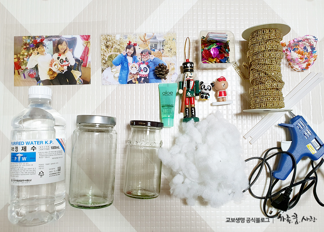 준비도 복잡하지 않아요. 스노우글로브 만들기 재료는 정제수 (물도 괜찮아요). 글리세린(알로에겔도 괜찮아요), 유리병(스파게티 소스병 같은 재활용도 좋아요) 솜, 글루건, 반짝이 가루, 크리스마스 미니 장식 혹은 오너먼트, 솔방울, 리본테이프, 코팅된 사진, 나무젓가락이 필요합니다. 하지만 이 모든 재료가 다 필요한 것은 아니니 집에 가지고 계신 재료를 충분히 활용해보세요.