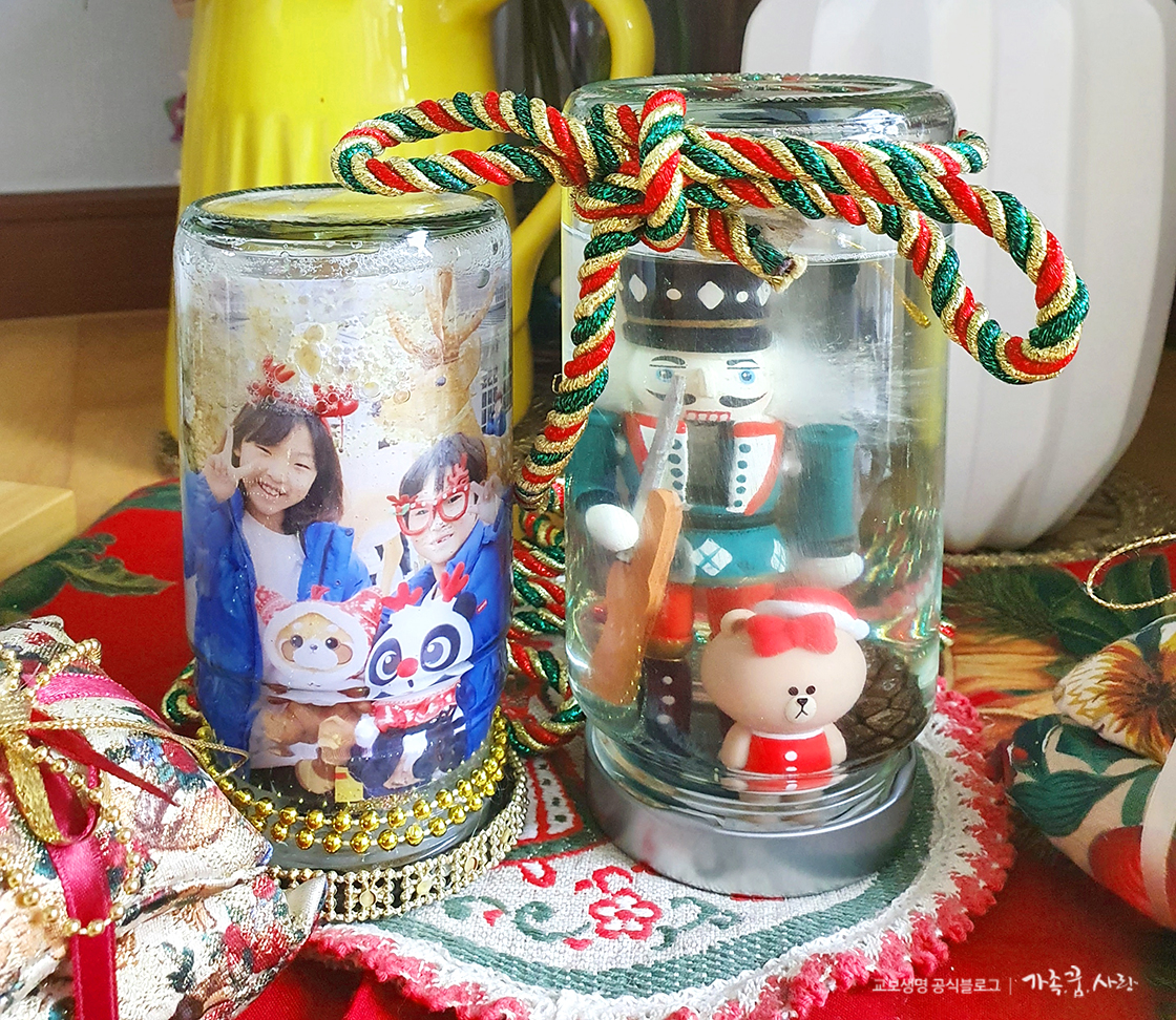 점점 크리스마스와 연말 분위기가 차분해지는 듯 하지만 아이들에게는 여전히 크리스마스는 연말 최대 이벤트입니다. 여전히 동심을 간직하고 있는 아이들을 위해 예쁜 크리스마스 장식을 지나칠 순 없어, 집안도 꾸미고 아이들도 추억을 오래 간직할 수 있는 우리 집만의 특별한 스노우글로브를 만들어 보기로 했어요.
