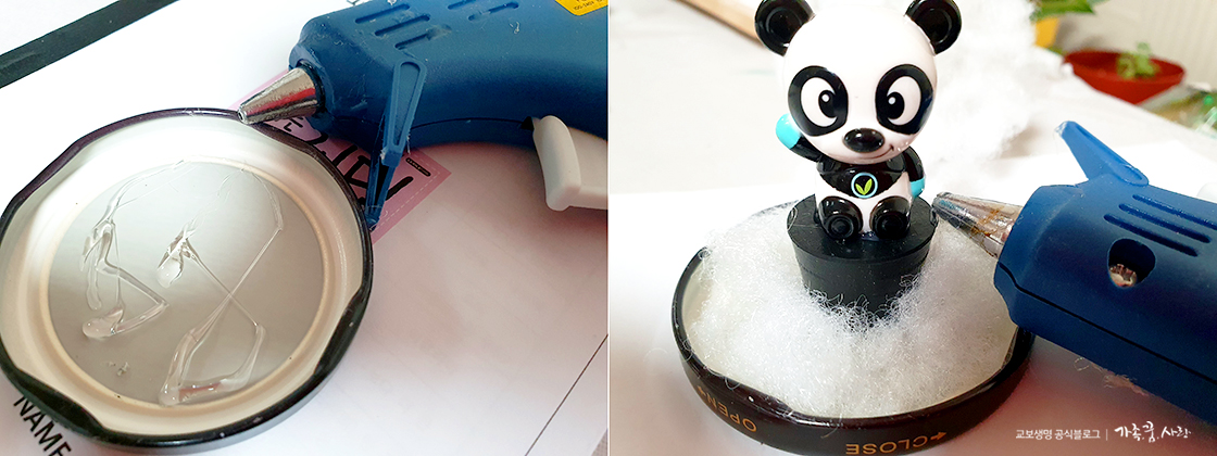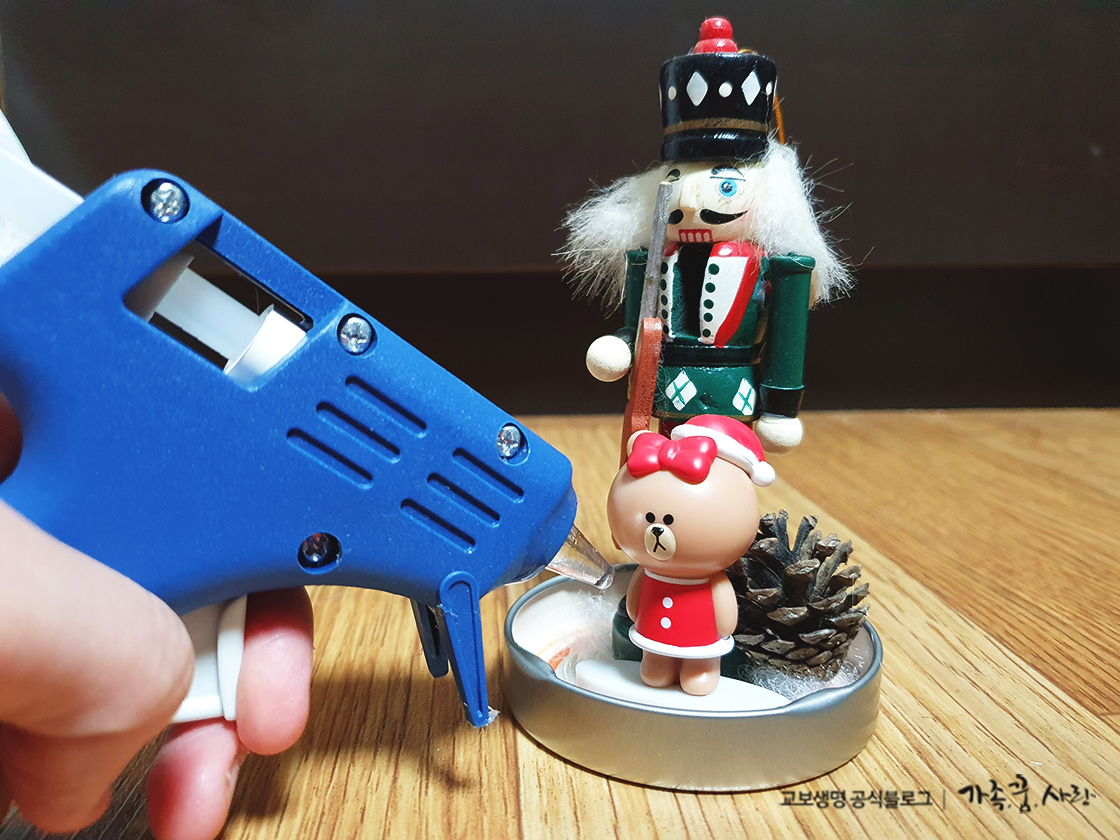 아이와 함께 하다보면 크리스마스 오너먼트, 솔방울, 케익 피규어, 미니 인형 등 다양한 소품이 은근히 많이 생깁니다. 버리기도 애매하고 보관하자니 자리를 너무 차지하는데, 이럴 때 이용하면 좋아요. 활용할 소품을 정했으면 유리병 뚜껑에 글루건을 활용해 솜와 크리스마스 장식품을 고정해줍니다. 20초 정도 그대로 두어야 단단하게 고정됩니다. 떨어지지 않도록 많이 발라주세요. 글루건이 없으면 순간 접착제도 괜찮습니다.