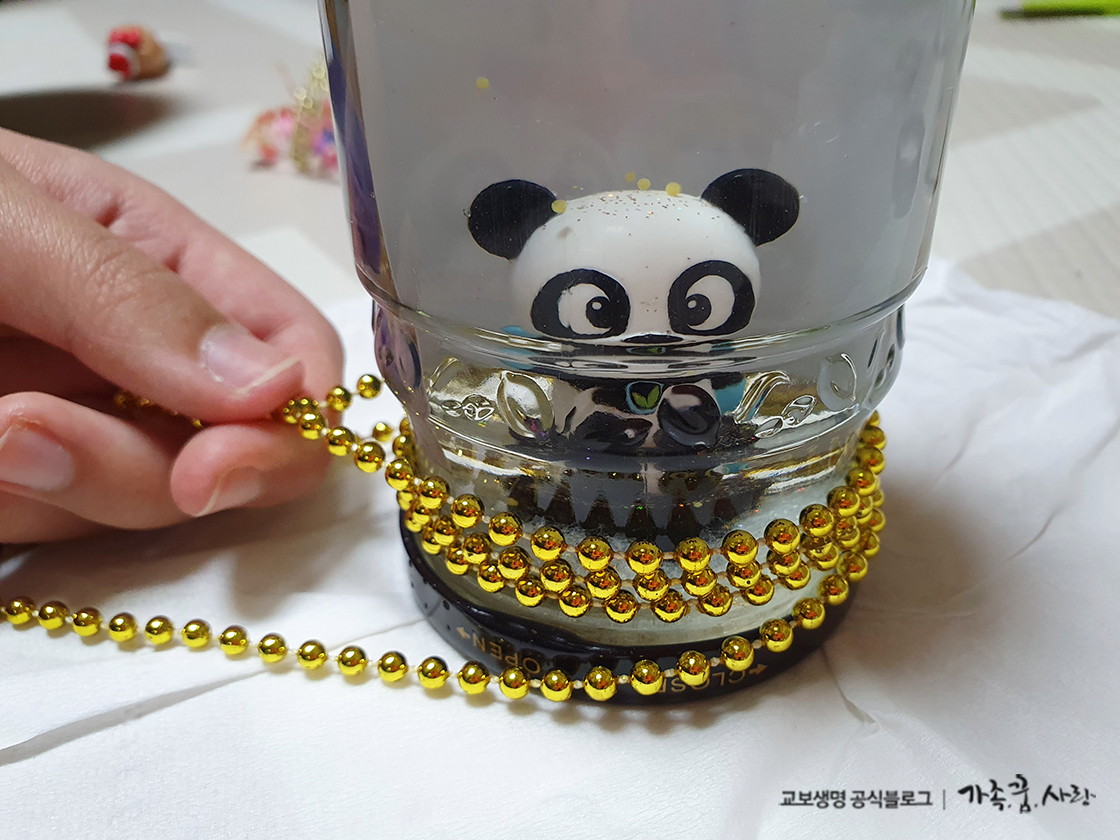 뚜껑 부위도 예쁘게 장식해주면 좋은데요. 리본테이프나 반짝이는 골드볼 같은 걸 둘러주면 더 예뻐집니다. 이렇게 하면 흔들 때마다 금빛 반짝이 가루가 어우러지는 멋진 스노우글로브 완성입니다!