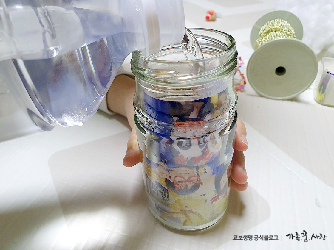 세상 어디에도 없는 나만의 스노우글로브입니다. 아이들과 추억을 기억하기도 좋죠. 가장 좋은 건 크리스마스 분위기가 물씬 풍기는 아이들의 얼굴이나 추억이 담긴 사진입니다. 그게 없다면 크리스마스 분위기가 잘 느껴지는 눈 내리는 풍경 사진 같은 걸 준비해주세요. 액체에 담가야 하니까 코팅하는 걸 잊지 마세요. 투명 시트지로 사진을 완전히 밀착하면 됩니다. 사진은 유리병 뚜껑이 아래로 향하도록 넣어주세요. 나중에 거꾸로 세워야 하니까요.