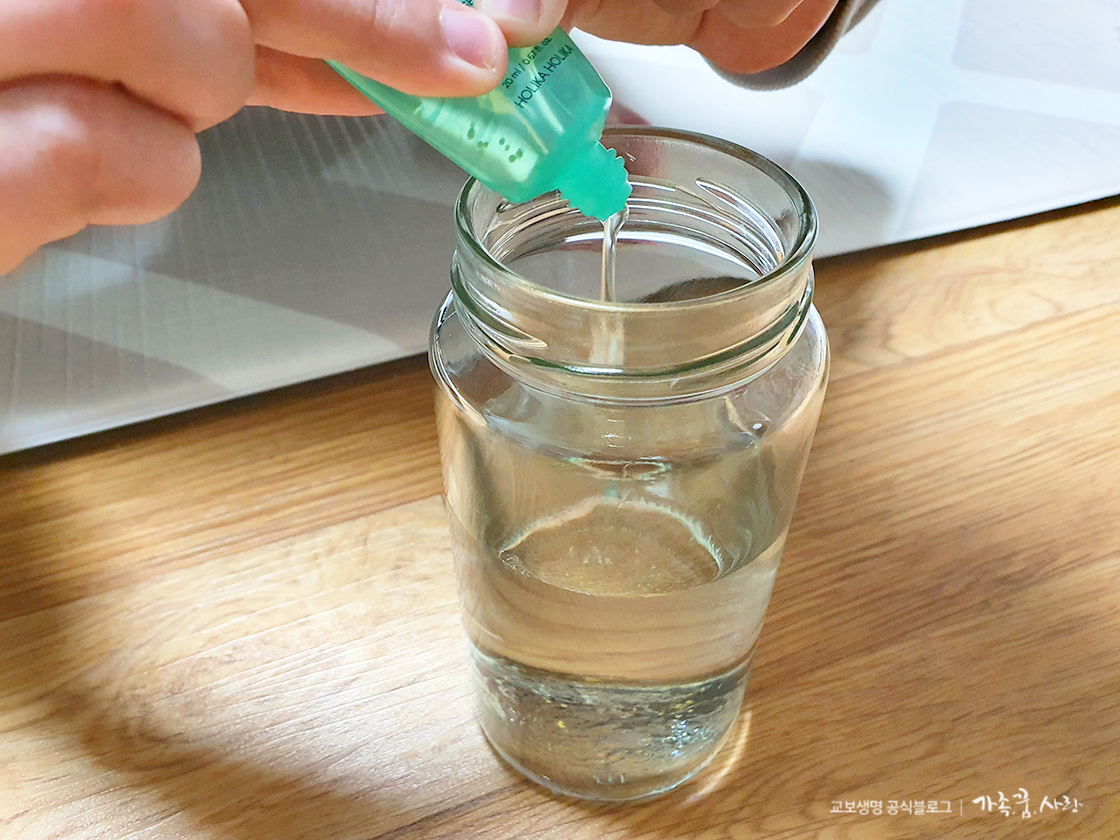 물은 넣은 다음 글리세린을 첨가합니다. 글리세린 양은 물 2컵에 글리세린 1티스푼 비율로 넣어주세요. 글리세린을 너무 많이 넣을 경우 반짝이 가루가 잘 뿌려지지 않으니 2대1 비율을 맞추는 것이 중요해요. 글리세린은 약국에서 쉽게 살 수 있어요. 글리세린이 없다면 알로에겔을 활용하셔도 좋습니다.