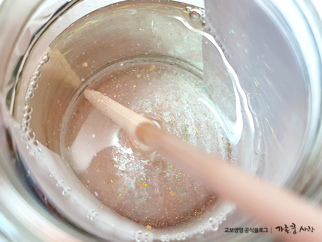 이제 화려함을 더할 차례입니다. 2티스푼 정도 반짝이 가루를 넣은 후 나무젓가락으로 골고루 섞어주세요. 금색도 좋은데 다양한 색상이면 더 화려하고 예쁩니다. 주의할 점은 반짝이 양이에요. 가루를 너무 많이 넣으면 스노우글로브 장식품이 잘 보이지 않아 예쁘지 않습니다.