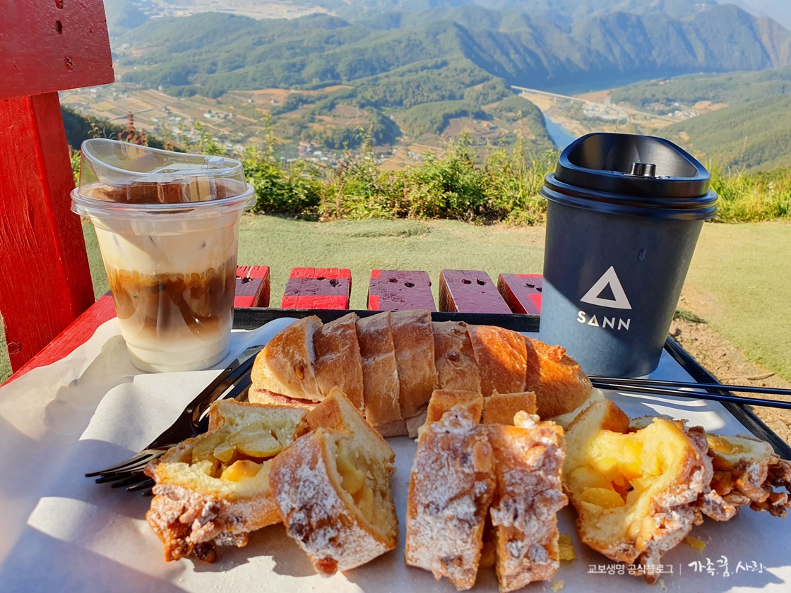 패러글라이딩 비행을 마치고 카페산에서 아름다운 뷰를 바라보며 맛보는 빵과 커피는 그야말로 꿀맛! 베이커리 맛집답게 빵이 신선하고 아주 맛있었어요. 아름다운 풍경 속에서 짜릿한 스릴감을 만끽하는 패러글라이딩 체험을 하고, 맛있는 디저트도 먹으니 그동안의 답답한 마음이 한순간 날아간 것 같이 행복해졌습니다.