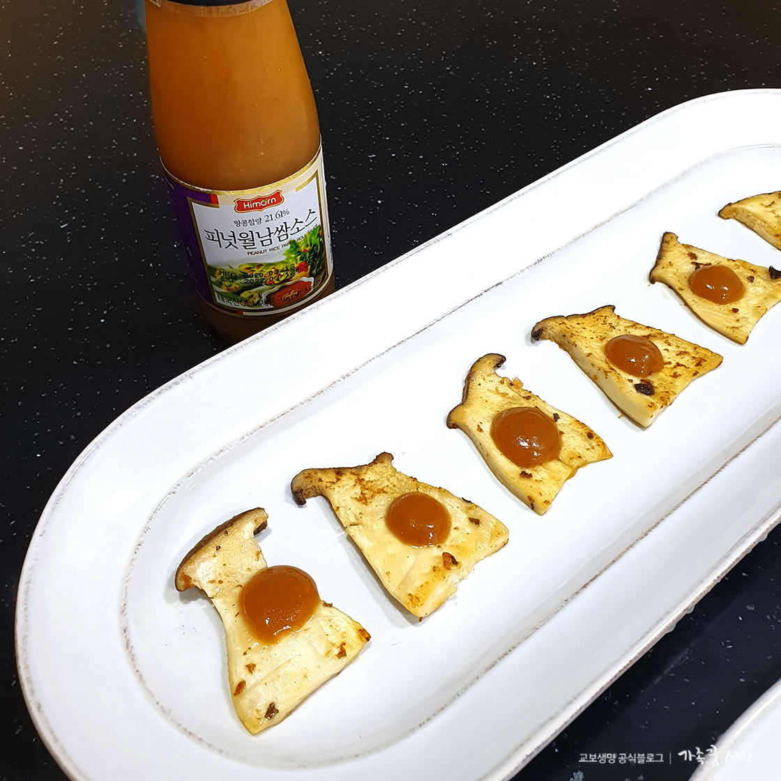 접시 위 새송이 버섯에 피넛 월남쌈 소스나 스위트 칠리소스를 취향대로 조금씩 올린 후 그 위에 구운 새우와 얇게 썬 대파나 쪽파를 올리면 됩니다. 소스는 취향대로 고르면 됩니다. 안주는 물론 밥반찬으로도 잘 어울리는 요리입니다.