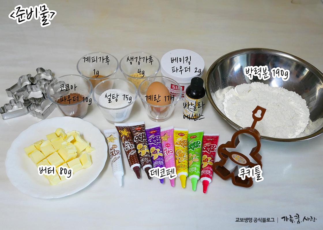 필수 재료 : 박력분 190g, 버터 80g, 설탕 75g, 생강가루 4g, 계핏가루 1g, 베이킹파우더 2g, 계란 1개, 쿠키 틀