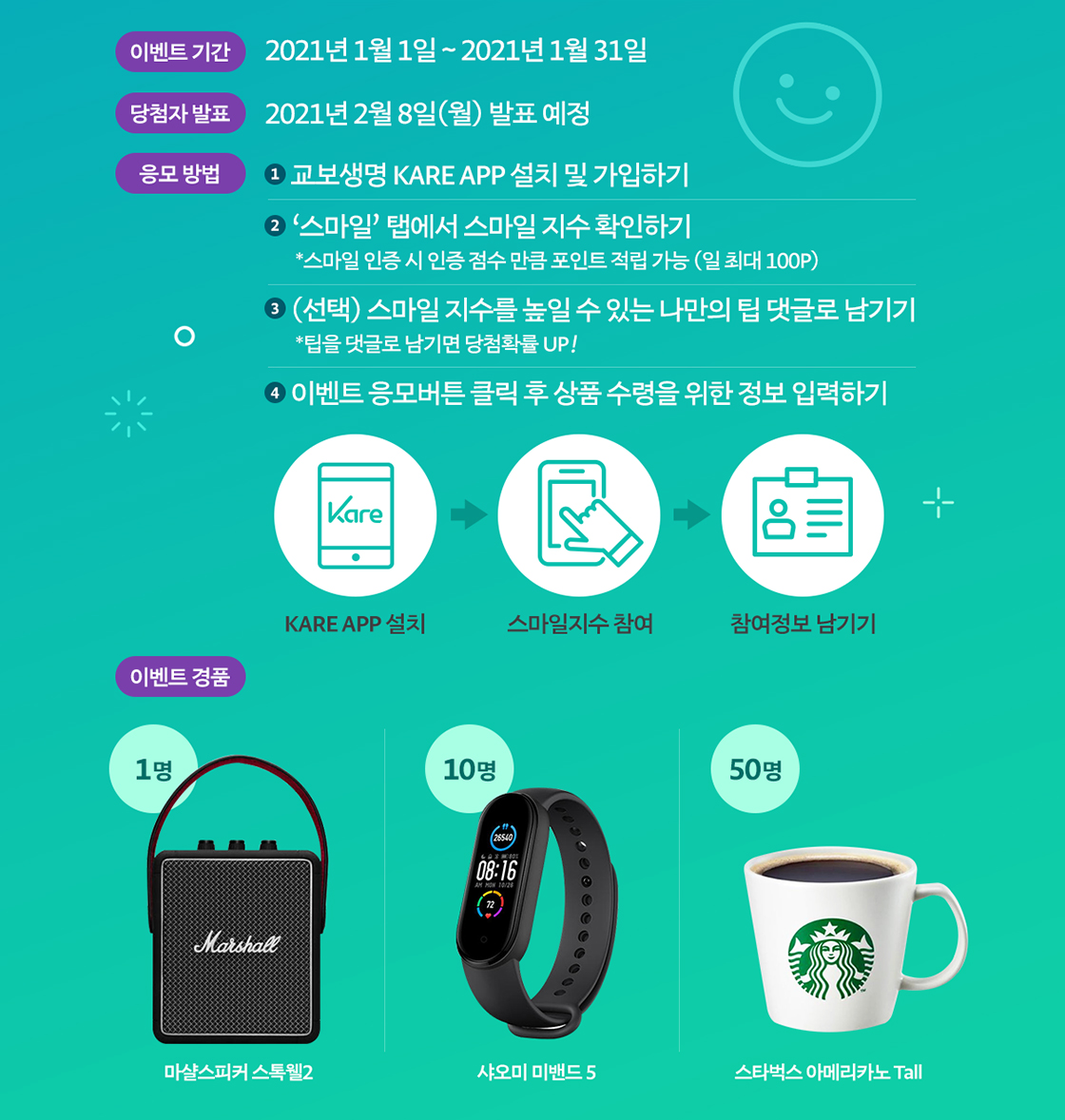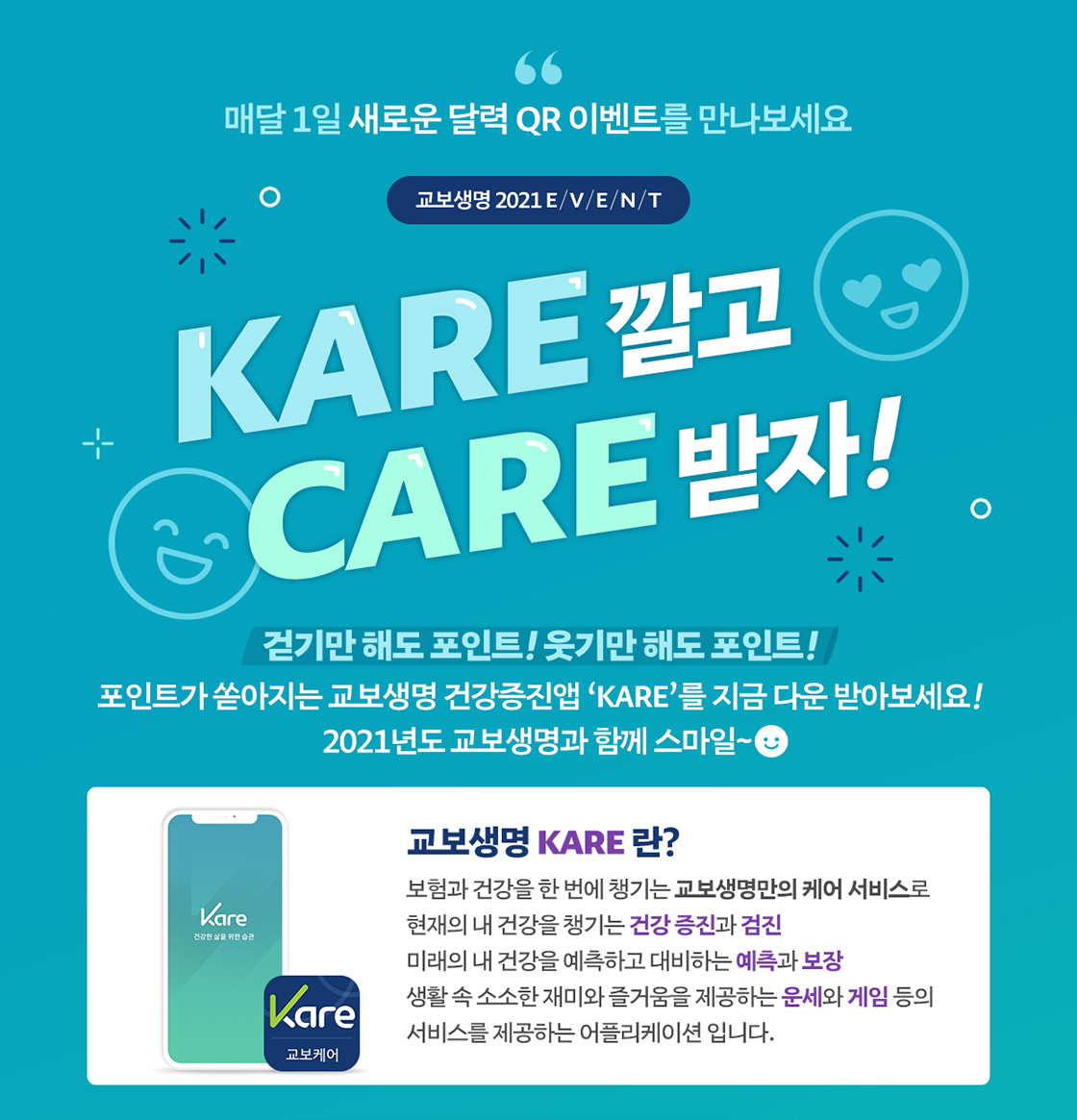 KARE 깔고, CARE 받자! 걷기만 해도 포인트! 웃기만 해도 포인트!