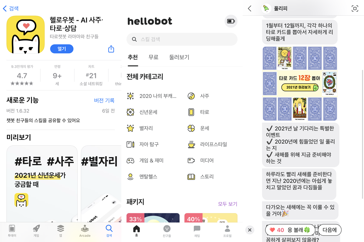 헬로우봇은 특히 타로가 잘 맞는다는 입소문을 타고 유명해진 어플입니다. 다양한 캐릭터의 AI 챗봇이 신년운세부터 사주, 타로, 운세까지 알려주는데요, 실제 점술가나 타로 마스터와 문자로 대화하는 듯한 분위기가 특징입니다. 다만, 일부 유료 콘텐츠들의 경우 하트를 충전하여 확인할 수 있습니다. 가벼운 고민 상담 겸 운세를 보고 싶은 분께 추천해요!