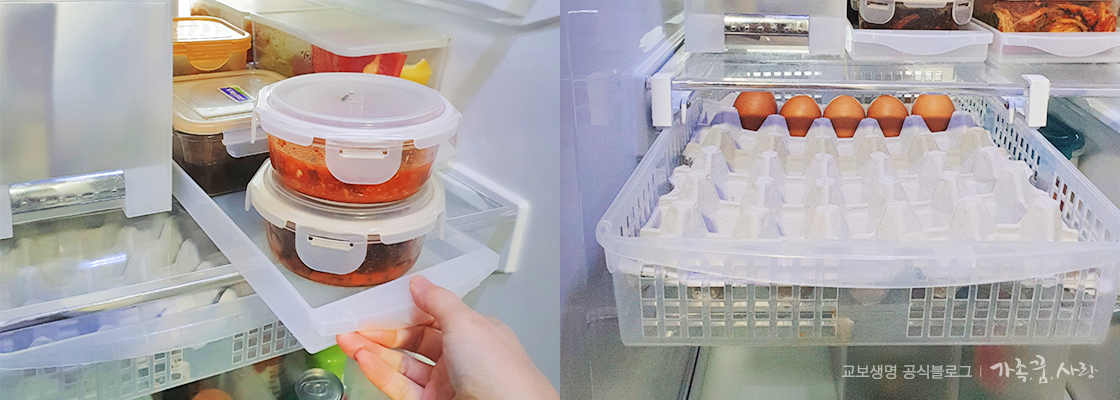주부라면 냉장고 반찬통 정리도 매번 고민입니다. 크고 넓은 냉장고를 장만해도 어느 순간 꽉 차 넣을 공간이 부족하기 때문이죠. 일단은 필요한 것만 구매해서 그때그때 사용하고 오래 보관하지 않은 것이 좋습니다. 빨리 먹을 수 없는 짱아치나 젓갈, 김치류는 반찬통을 같은 형태로 여러 개 구입해 정리 트레이를 활용하면 됩니다. 모양이 같기 때문에 안정감있게 쌓을 수 있고, 트레이를 이용하면 꺼내쓰기가 편리합니다.