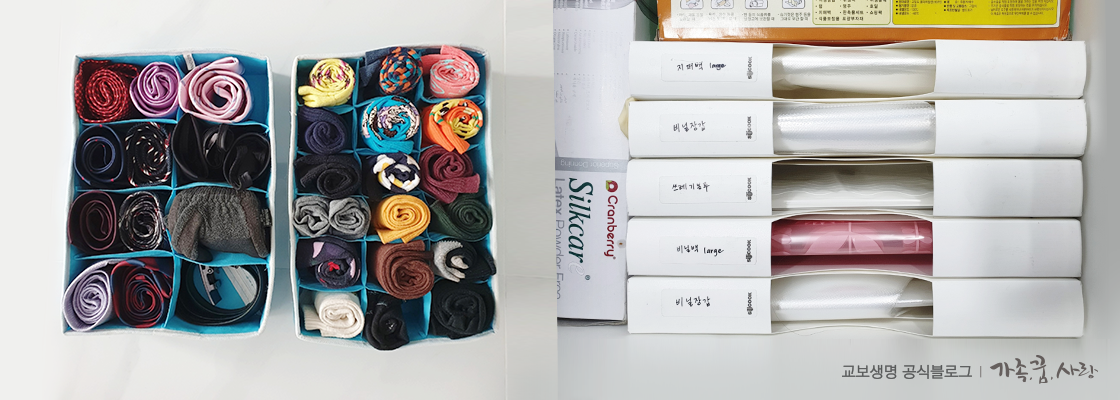 물건을 정리하는 것은 그냥 쌓아둔다는 것이 아닙니다. 각각의 용도에 따라 보기 좋게 수납하는 방법이 있습니다. 양말은 목이 늘어나지 않게 돌돌 말아 수납함에 넣어두면 좋습니다. 속옷류는 는 삼등분으로 접어 정리하면 같은 공간에 더 많은 양을 넣을 수 있습니다. 비닐장갑이나 비닐봉투류는 시중에서 판매되는 비닐봉투 정리함을 쓰면 필요할 때 뽑아쓰기도 편하고 좁은 싱크대 서랍을 더 넓게 쓸 수 있습니다.