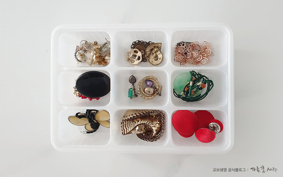 정리 정돈하기 쉽지 않은 품목 중 하나가 작은 물건들입니다. 귀걸이, 목걸이, 브롯치, 실핀과 같은 물건들은 한 데 모아 두다 보면 어디에 무엇이 들어 있는지 알기가 쉽지 않죠. 잃어버리기도 쉽고요. 이럴 때는 과자틀을 이용해보세요. 쿠키가 들어있는 플라스틱 용기는 훌륭한 수납용기가 됩니다.